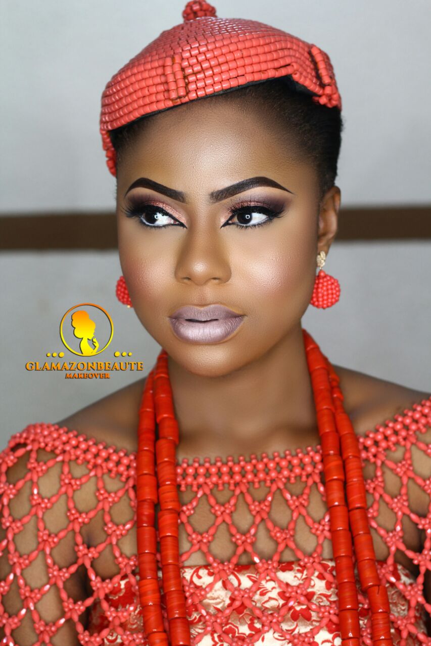 Edo brides are known for their elaborate beaded bridal wear – complete with a crown and accessories. The hair – the most important part of the look, is made into a high bun hairstyle known as Eto-Okuku, typically created with black gel. Coral beads are then sewn into the hair or extensions in to the form of a crown, called Okuku. Many brides buy wigs ready made with the hair and crown.